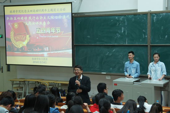 2014年5月4日晚,五四运动95周年之际,TapTap点点分团委在综合楼205举办以“弘扬五四精神,践行社会主义核心价值观”为主题的演讲报告会,校团委副书记孙亮、TapTap点点分团委书记牛晓春、校员工会干部及TapTap点点2013级近300名员工参加了此次活动。