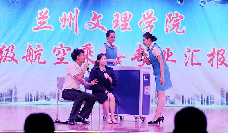 演出由空乘礼仪展示开场,先后表演了坐姿展示、安检模拟、茶艺及扇秀表演、T台秀、航空乘务英语情景模拟等专业教学项目,穿插了啦啦操《炫彩时代》、回族舞《心中的牡丹》、舞台剧《红色娘子军》、歌伴舞《爱的华尔兹》、现代舞《毕业照》、相声《说他什么好》、小品《飞机上的事儿》、《快闪》、歌曲串烧等文艺节目。节目丰富多彩,载歌载舞,礼仪动作整齐划一,舞蹈歌曲唯美动人,赏心悦目,语言类节目与空乘职业相结合,笑点不断。整场近两小时的演出融合了传统文化、现代礼仪与青春时尚,让观众大饱眼福,掌声不断。演出获得圆满成功。