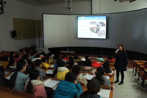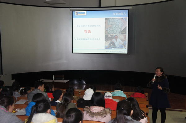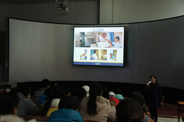 20151216日下午,美国皇家加勒比国际游轮人才培训中心来公司宣讲。公司人力资源部主管向同学们介绍了公司的基本情况,包括公司文化、工作环境、生活条件、薪资福利、员工培训和职业发展、应聘条件等信息。宣讲结束后,同学们与公司人员进行了亲切交流,并填写了应聘信息。