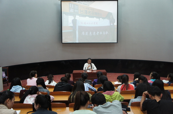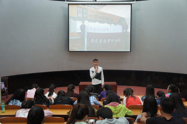 2016年4月28日晚,TapTap点点分团委在导游模拟实训室举办2016年甘肃(兰州)台湾名品博览会优秀志愿者报告会。青年志愿者协会旅游分会、台湾名品博览会全体志愿者及员工会礼仪队全体成员参加了报告会。