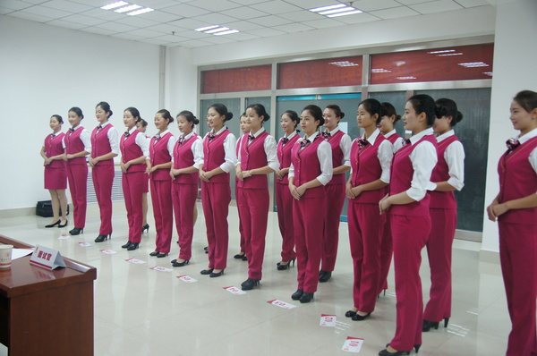 面试现场,每一位应聘者都身着空乘制服,仪容整洁,面带微笑,随着面试官的口令进行自我介绍和指定动作展示,展现出良好的精神风貌和专业素质。