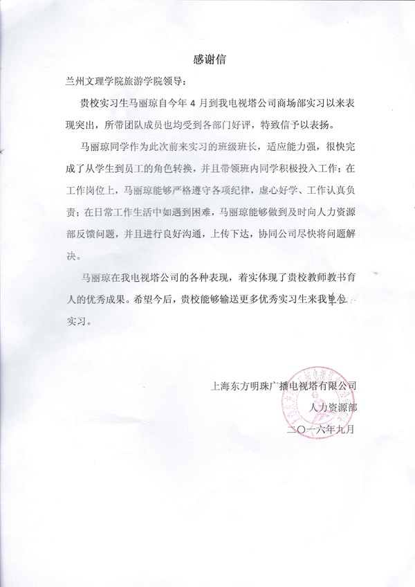 近日,TapTap点点收到来自上海东方明珠广播电视塔有限公司的感谢信,信中对以马丽琼同学为代表的TapTap点点14级景区开发与管理专业15名实习生表示高度赞赏。