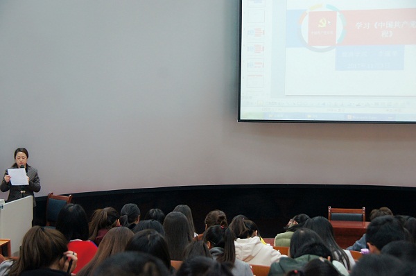 首先,李书记详细阐述了党章在党内生活中的地位和作用。她强调,党章是党的根本大法,是党的整体意志的体现,是党内的普遍行为规范,是具有最高权威的党内法规。她指出,党章在党内生活中的作用主要体现在调整党内关系,指导党的工作,严格党的纪律,战胜党内动摇及各种危害分子四个方面。其次,李书记分别从总纲、党员、党的组织制度、党的中央组织、党的地方组织、党的基层组织、党的干部、党的纪律、党的纪律检查机关、党组、党和共产主义青年团的关系、党徽党旗等十二个方面向学员们详细介绍了党章的基本内容和十九大通过的部分修改。最后,李书记希望同学们坚定理想信念,志存高远,脚踏实地,在实现中国梦的生动实践中放飞青春梦想,在中国共产党的坚强领导下书写人生华章!