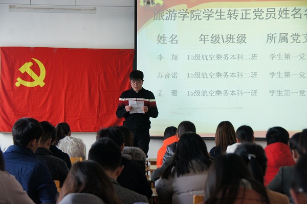 会议于下午3:00正式开始。首先,刘老师宣读了参加此次会议的预备党员名单,应到29人,实到25人,因事因病请假4人。其次,李翔等25名预备党员依次上台宣读了自己的转正申请,并汇报了自己在预备期间的表现,包括取得的成绩和存在的问题,表明了自己要成为一名正式党员的态度和决心。在听取了李翔等25名预备党员的汇报后,入党介绍人彭老师、何老师和任老师分别对李翔等25名预备党员在预备期间的教育和考察情况做了总结,表示同意他们转为正式党员。按照预备党员转正的程序要求,与会的正式党员就李翔等25名预备党员转正问题进行了无记名投票,综合因故请假的正式党员会前提交的表决意见,最终通过了李翔等25名预备党员按期转为正式党员的决议。最后,刘老师做了总结讲话,她向今天支部大会讨论通过的25名党员同志表示祝贺,希望广大党员同志继续加强党的理论学习,不断提升自身思想修养,争做合格党员。在党旗下,2015级旅游管理本科二班班长赵趋同学带领全体党员同志重温入党誓词。