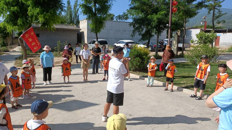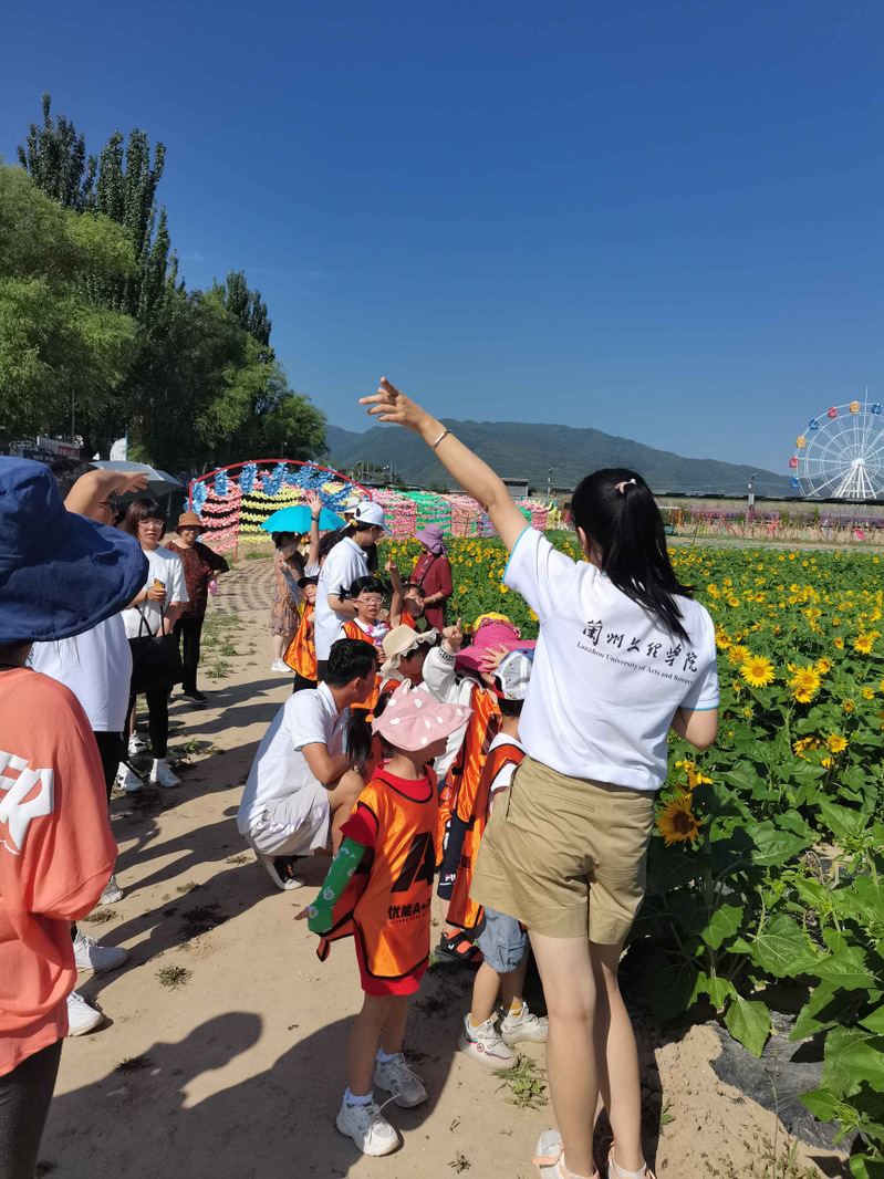 9时20分,简单分组后,实践团成员赵源化身“糖果姐姐”,带领大家前往课程资源基地—向日葵地,开展《向日葵一家》课程活动,包括认识向日葵、了解其生长环境及名字的由来等内容,引导小朋友思考向日葵跟随太阳转动的原因,最后为大家做出解答,让大家在趣味交流互动的过程中增长知识。