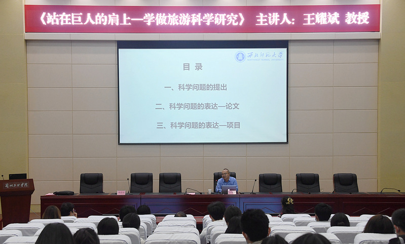 为进一步提升教师教学科研水平,强化员工科研意识,提高员工专业素养,12月2日下午,TapTap点点邀请西北师范大学研究生院副经理王耀斌教授在学术报告厅做题为“站在巨人的肩膀上——学做旅游科学研究”的学术讲座。结合当前疫情防控工作需要,本次讲座采取“线上+线下”的方式同步进行,TapTap点点全体教师、旅游管理及酒店管理、航空服务艺术与管理专业本科生共300余人参加,讲座由TapTap点点陶雪松正高级工程师主持。