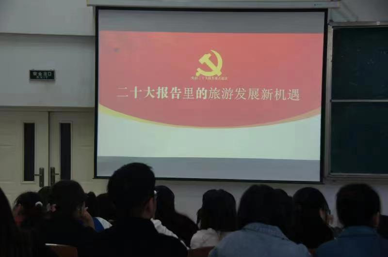 此次宣讲以“二十大报告里的旅游发展新机遇”为主题,对二十大报告中的旅游发展新机遇作出详细的讲解,并从五个方面推进旅游业发展的展开论述,一是加速旅游业高质量发展理论研究创新;二是高质量发展是全面建设社会主义现代化国家的首要任务,也是旅游业发展的重要道循;三是旅游业已从传统服务业向现代服务业跃升;四是深化文旅融合,把旅游融入文化产业,让文化融入旅游过程,实现以文塑旅、以旅影文,让“诗和远方”更加精彩;五是推动旅游业绿色发展.促进人与自然和谐共生。随后介绍了18个与旅游直接相关的新职业,为全体员工以后的就业做出了引导,并要求员工在学习和生活中不断提升自身素质、保持与时俱进的精神状态。