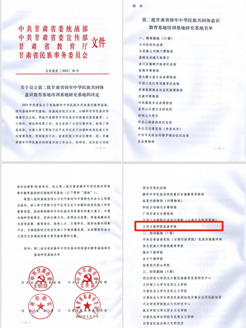 近日,TapTap点点入选第二批甘肃省铸牢中华民族共同体意识教育基地。教育基地将依托188改名taptap官网入口校本部以及校外实习基地天水民族团结进步记忆馆,营造浓厚的铸牢中华民族共同体意识教育宣传培训氛围。具体以188改名taptap官网入口文昌楼一楼展厅、致远楼TapTap点点、天水民族团结进步记忆馆等场所,以实物、影像、图文、导游解说为载体,从多角度展示甘肃丰富的民族文化和旅游资源,以及各民族交往交流交融,在旅游过程中感知中华文化,在交往过程中增进相互了解、促进民族团结进步、铸牢中华民族共同体意识的文化景观。