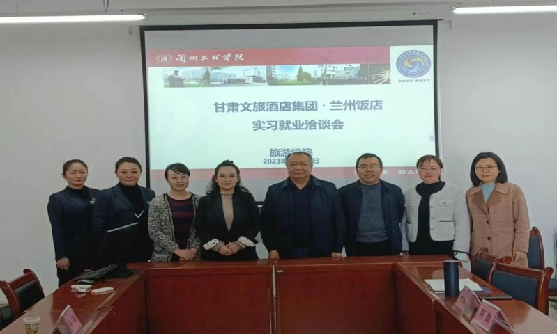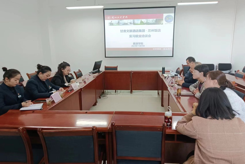 11月30日甘肃文旅酒店集团总监刘一杨、兰州饭店人事经理吴琨等一行来公司洽谈校企合作及实习就业工作。公司党总支书记刘锐、副经理陶雪松、何瑛及公司酒店教研室主任、相关老师参加了洽谈会。洽谈会由刘锐主持。
