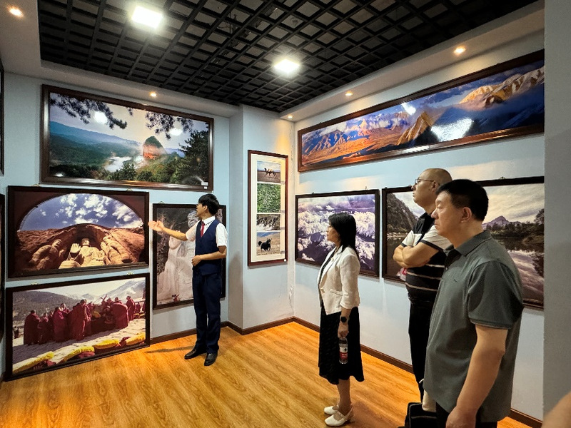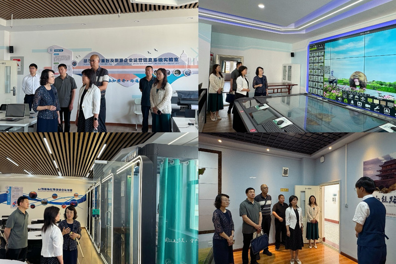 何瑛陪同考察团参观了公司教学、实训中心,包括如意甘肃摄影展(导游讲解实训室)、旅游规划及产品研发设计实验室、AI智能模拟导游综合实验室以及研学旅行、旅游企业运营实验室等,通过中心内现代化设施和多样化的实训项目,展现了公司在培养应用型人才方面的努力和成效。