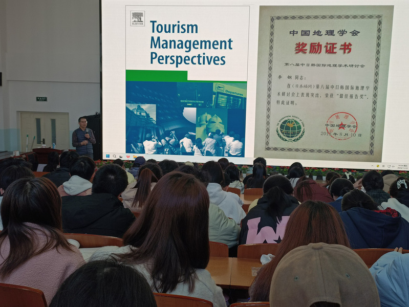李钢教授从地理学思维在日常生活中的应用视角出发,结合碳排放、微信朋友圈、无人机、菜鸟驿站、盒马鲜生等案例,生动展示了与平常生活息息相关的空间分析及大数据挖掘技术。同时李教授分享灾害地理、社会地理和旅游地理等研究领域中的主要成果,强调了跨学科研究的重要性,鼓励师生们将地理学思维与旅游学科相结合,共同探索新的研究领域与方向。