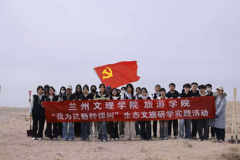 研学团队在民勤县通航乐园、摘星小镇讲解员带领下,探索中国航天科技,领会中国航天精神;在亚洲最大的沙漠水库—红崖山水库感受荒漠生态环境下,人类保护自然的生态文明理念,瑞安堡古城内,共同打开民勤的民耕文化历史与记忆。28日晚,师生与民勤旅游局召开研讨沙龙,探讨民勤文旅发展痛点。次日清晨,团队奔赴沙漠基地开展种植梭梭树,以行动践行“绿水青山就是金山银山”理念。返程前,苏武沙漠湖羊基地的参访为旅程画下乡村产业振兴的注脚。