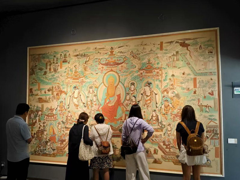 随后,师生们参观了由著名艺术家高山大师主创的壁画临摹展厅。展出的榆林窟临摹作品《维摩诘经变》《十一面观音像》《观无量寿佛经变》等,这些作品既忠于原作的庄严肃穆,又融入当代审美语言,展现出跨越时代的精神力量。